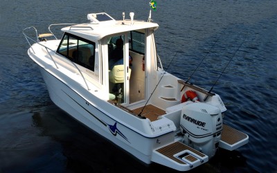 Her long list of standard features includes larger walking cockpit, integral fuel tank, cabin lockable sliding door, water proof sliding side windows in wheelhouse, overhead interior LED lighting throughout, generous on board storage and a molded polish fiberglass headliner in wheelhouse which provides a luxury feel and easy maintenance. There is a molded bench seat in the starboard side of the wheelhouse and comfortable U-shaped lounge in the forward cabin that converts into a berth. The forward cabin can also be equipped with a portable, electric toilet with a holding tank and macerator. For water sports enthusiasts, there has two big swim platforms and one of them features a recessed telescoping stainless steel ladder for easy water access.